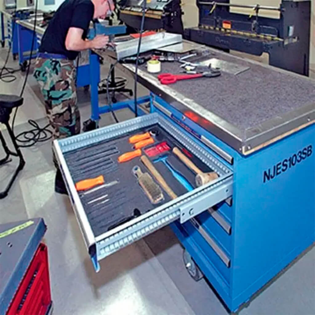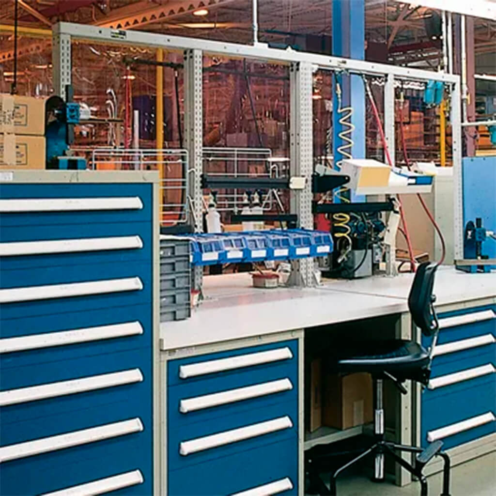 Estaciones de trabajo ergonómicas con almacenamiento integrado, ideales para tareas técnicas y mecánicas.